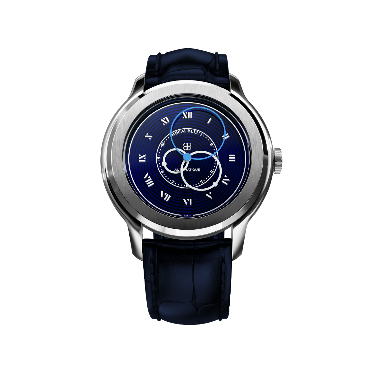 Les trois aiguilles circulaires de la montre Vitruve Origine Blue tournent sur un cadran sandwich. Le premier cadran fumé est tamponné de chiffres romains et repose sur le second cadran guilloché à la couleur bleue sombre.