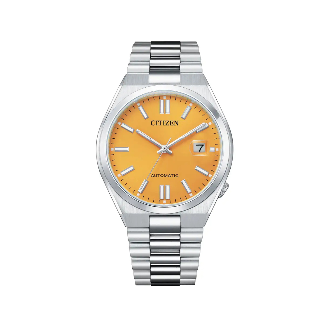 Montre Citizen - Collection Tsuyosa - Mouvement automatique, trois aiguilles, date, composée d'un boîtier acier de 40 mm, d'un cadran jaune et d'un bracelet acier.