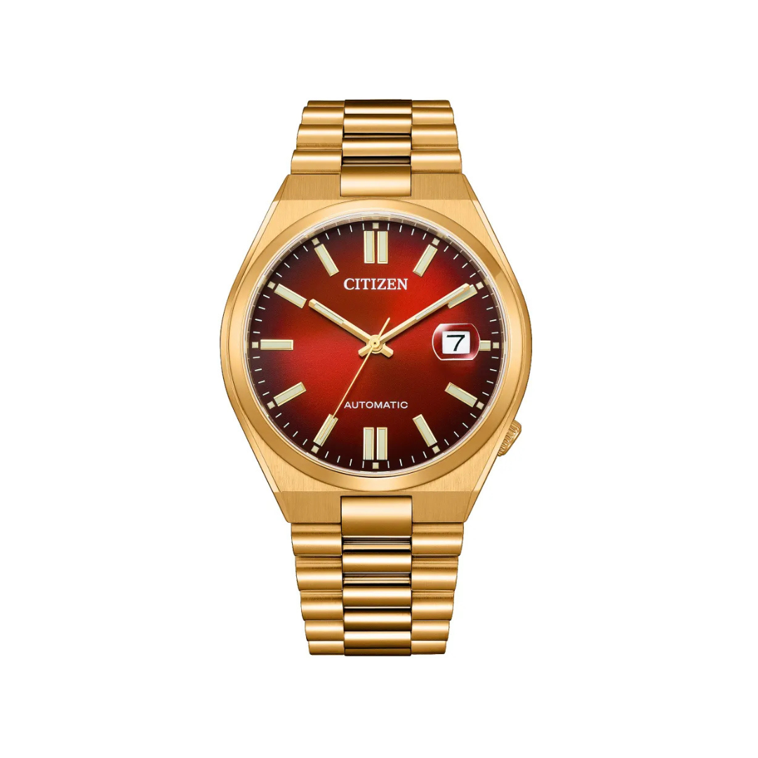 Montre Citizen - Collection Tsuyosa - Mouvement automatique, trois aiguilles, date, composée d'un boîtier acier de 40 mm, d'un cadran doré rouge et d'un bracelet Pvd Or. Etanche 50m