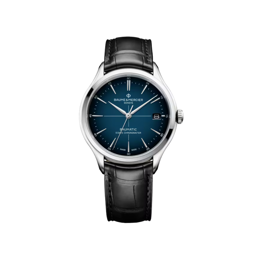 Montre-chronomètre suisse, la Clifton Baumatic 10467 équipée d'un mouvement manufacture automatique Baumatic, arbore un cadran bleu dégradé, un boîtier en acier inoxydable satiné ainsi qu’un bracelet en alligator noir finement surpiqué.
