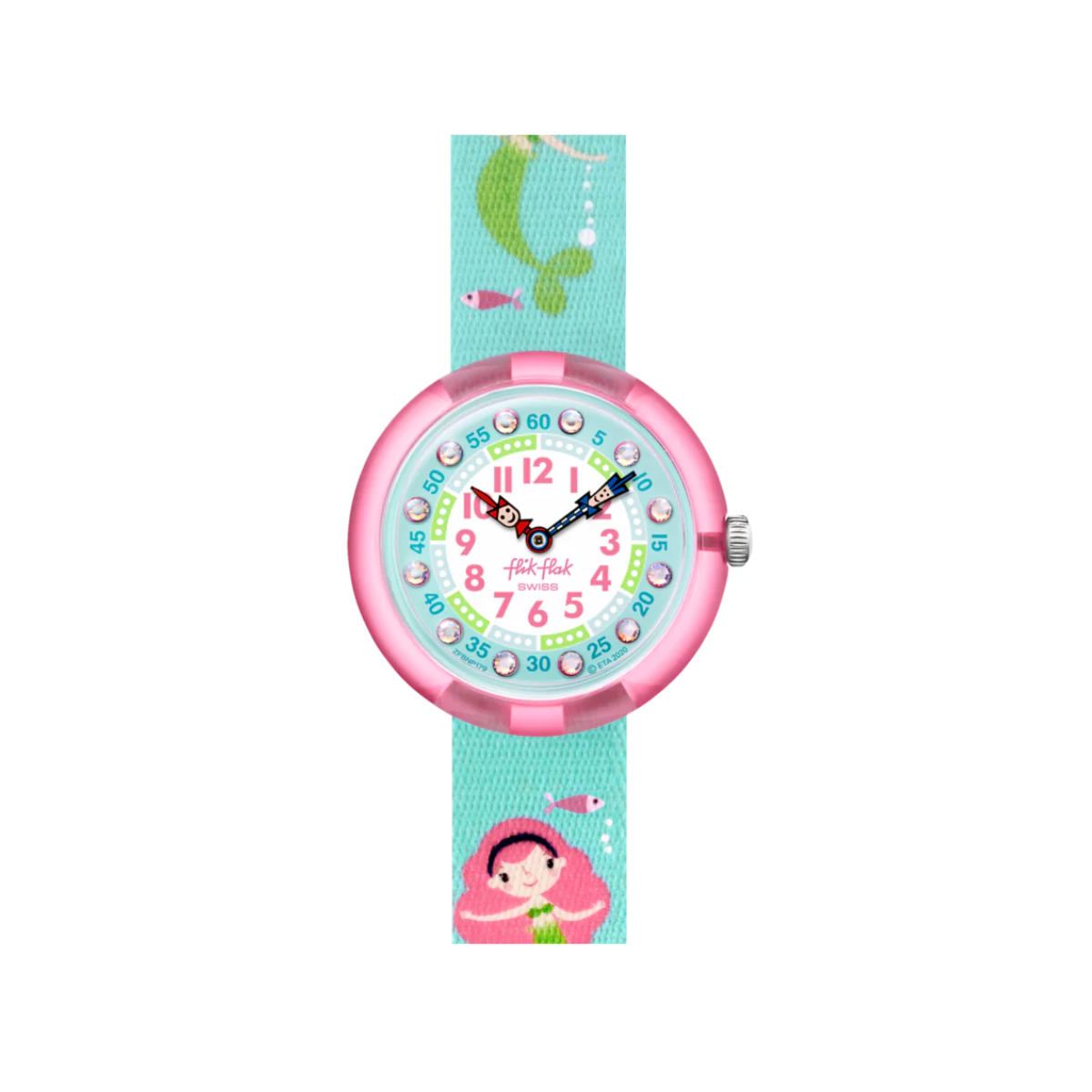 Les sirènes se parent de rose et vert sur la montre pédagogique MERMALICIOUS. Un cadeau idéal pour lire l’heure en rêvant de l’univers sous-marin.