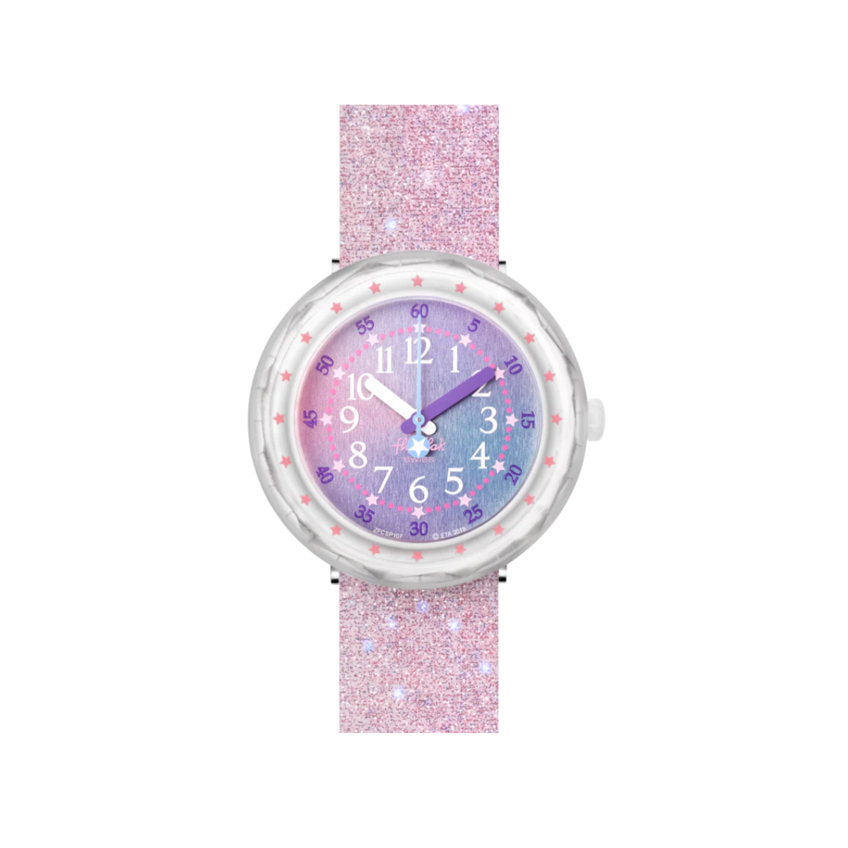 La montre pédagogique pour enfants PEARLAXUS aide à apprendre à lire l’heure avec un effet métallisé aux paillettes roses. Le cadeau des mini-stars.