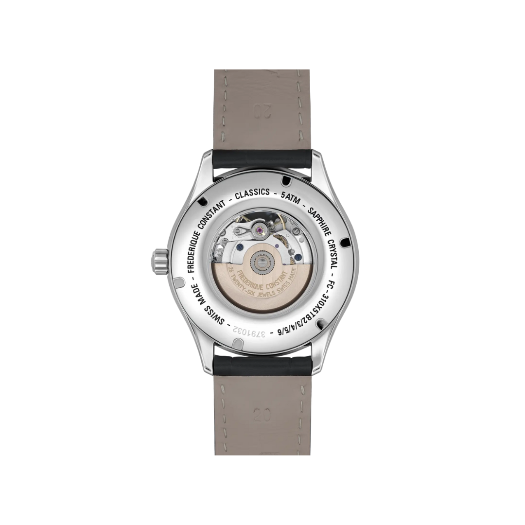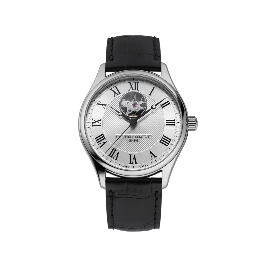 Avec un boîtier de 40 mm de diamètre et équipé du mouvement automatique FC-310 Heart Beat, cette montre affiche un cadran finement décoré, avec un style guilloché classique accentué par des index en chiffres romains traditionnels.