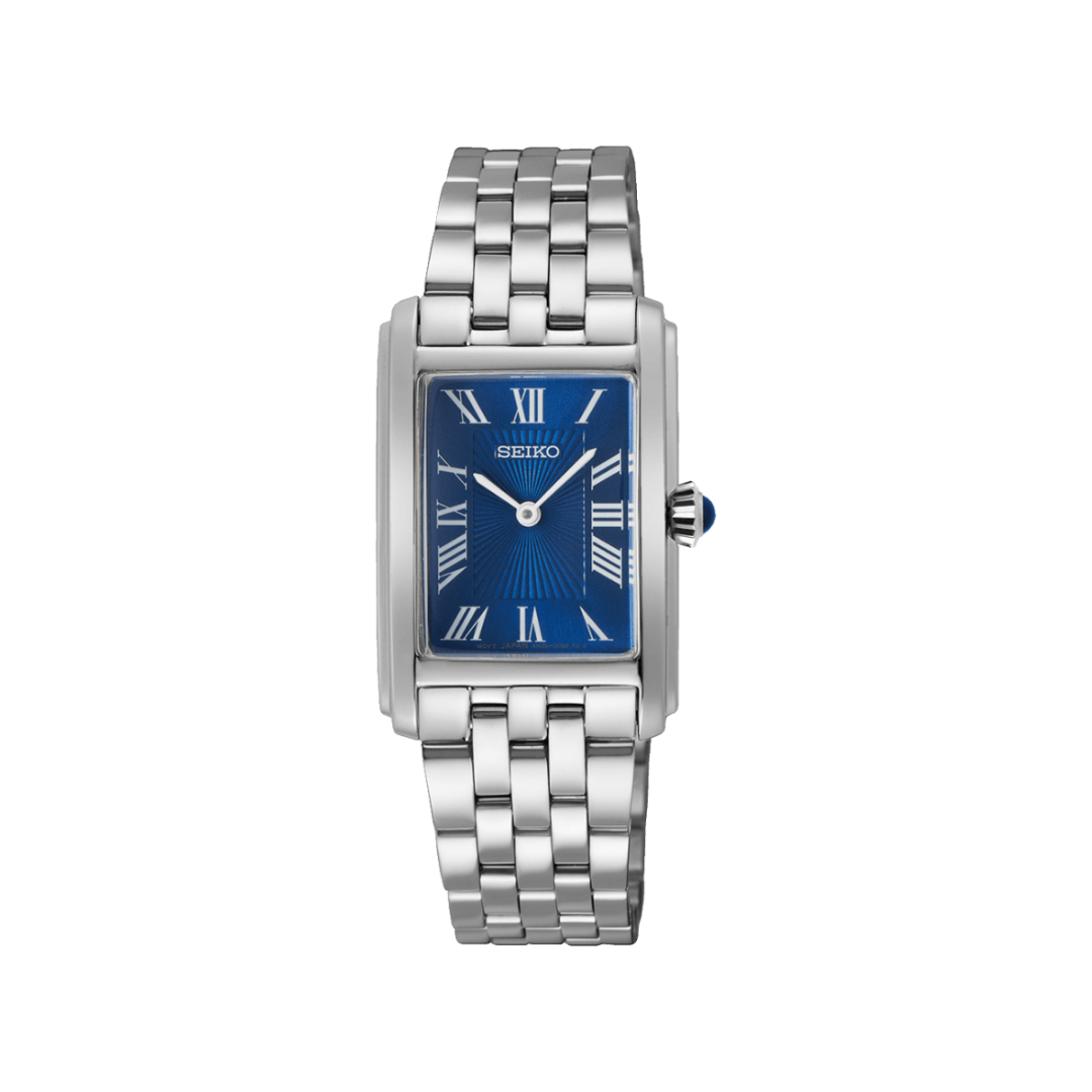 Idéale pour compléter vos tenues habillés la montre SWR085P1 se distingue par l'élégance de son boîtier et son cadran soleillé et satiné bleu. Cette montre en acier inoxydable est composée de chiffres romain et d'un joli cabochon bleu. Élégante et robuste, la montre a une étanchéité de 5 bar et est équipée d'un verre Hardlex bombé.