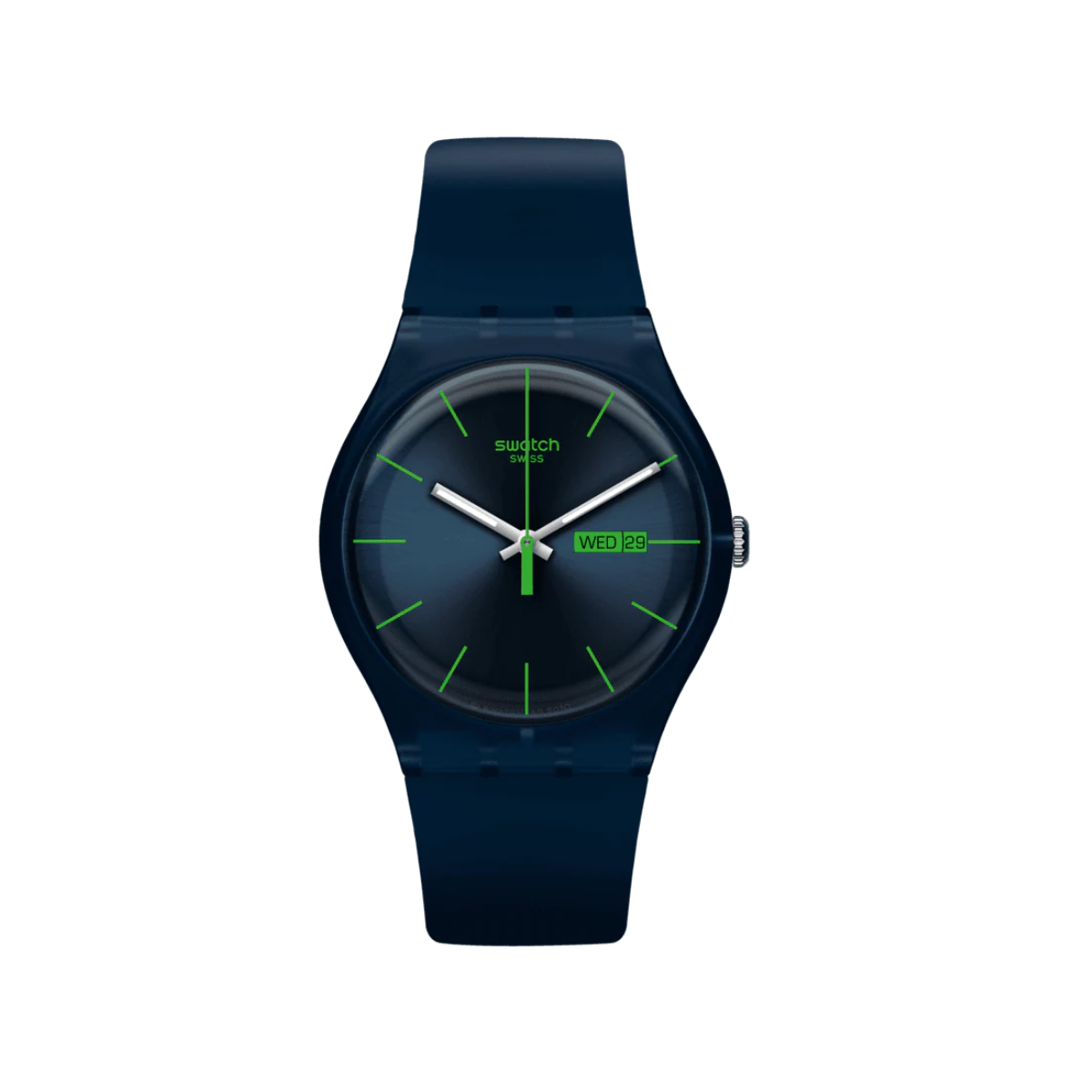 La couleur de ce design élégant et évocateur traduit l'humeur et l'ambiance. Cette New Gent fascinante comporte un bracelet à passant en silicone bleu uni avec un magnifique boîtier en plastique bleu transparent et une boucle assortie. Le boîtier contient un cadran brossé bleu avec des index verts fins pour les heures et une fenêtre noire sur fond vert contrasté pour le jour et la date à 3 heures.