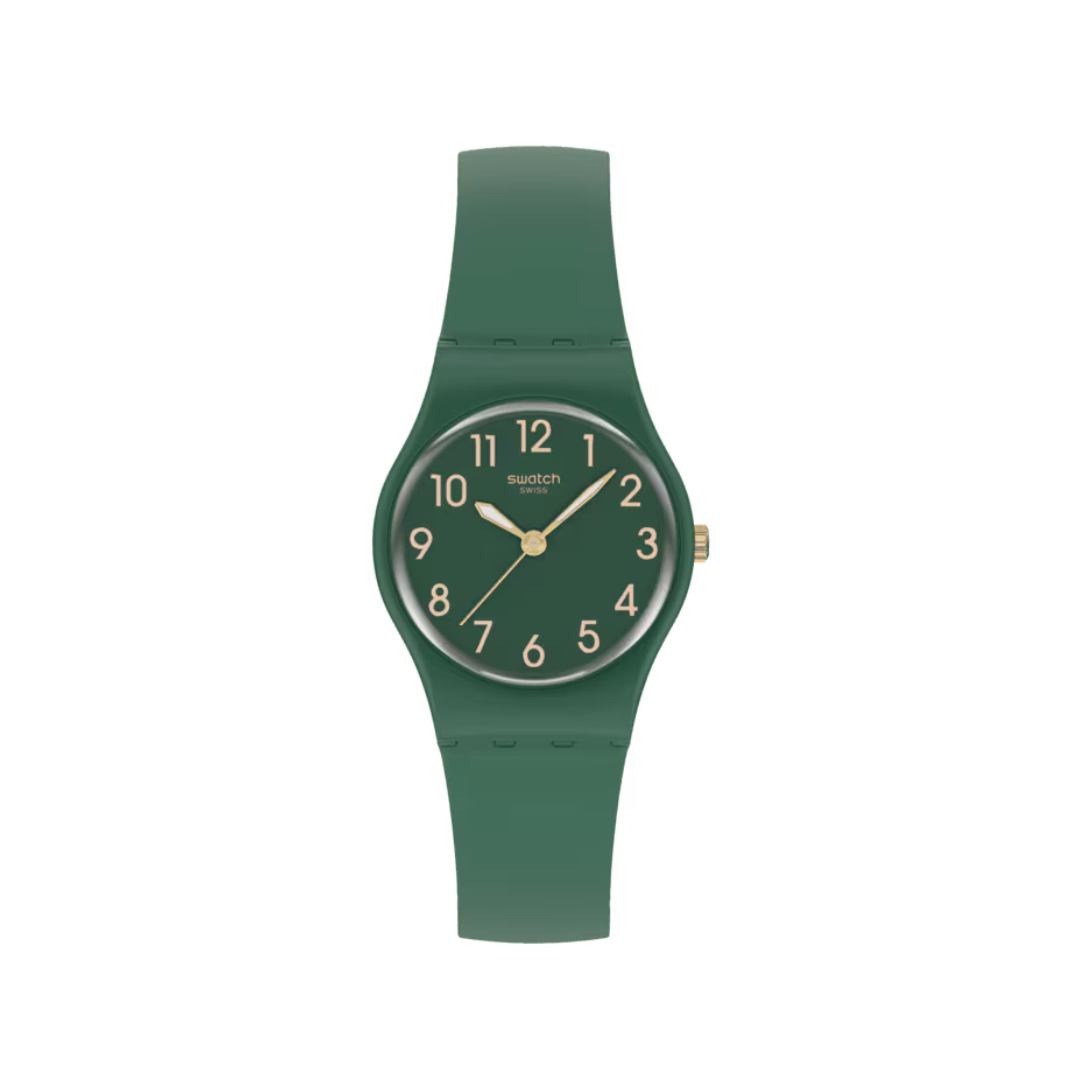 Cette montre possède un cadran vert foncé avec des chiffres imprimés en beige, des aiguilles des heures et des minutes couleur or rose à effet glow-in-the-dark et une aiguille des secondes couleur or rose. Le boîtier est vert foncé mat. Le tout est complété par un bracelet biosourcé vert foncé mat avec une boucle et un passant assortis.