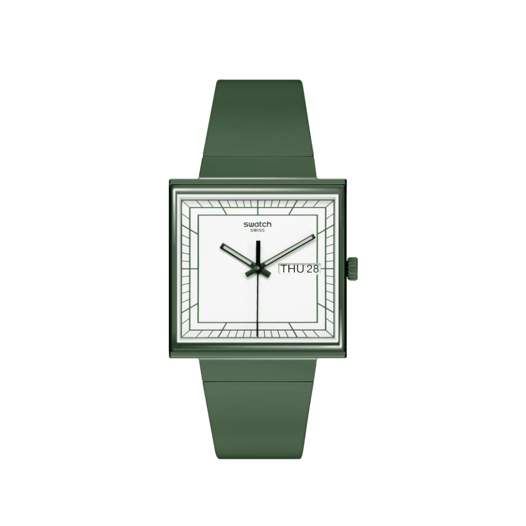Son boîtier carré en BIOCERAMIC arbore un verre bord à bord biosourcé qui offre une vue latérale sur les index de la montre. Le cadran carré est doté d’aiguilles glow-in-the-dark et d’un affichage du jour de la semaine et de la date à 3 heures. Un bracelet biosourcé intégré complète l’ensemble. Au dos, un couvre-pile imprimé représente un des cadrans dont est inspirée cette montre verte carrée.